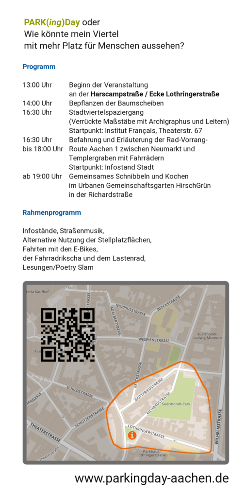 Der PARK(ing) Day ist ein seit 2005 international jährlich begangener Aktionstag zur Re-Urbanisierung von Innenstädten: In der Regel am dritten Freitag des Septembers werden Parkplätze im öffentlichen Straßenraum modellhaft kurzfristig umgewidmet und einer anderen Nutzung wie der als grüne Oase bzw. Pflanzinsel, als Gastronomie- und Sitzfläche, Fahrradabstellfläche usw. zugeführt. In Aachen findet der PARK(ing)Day seit 2016 statt. Dieses Jahr wurde das Suermondt-Viertel ausgewählt, um um Rahmen des städtischen Programms "nah, urban, vielfältig - ein Viertel in Bewegung" einen zusätzlichen Akzent zu setzen.