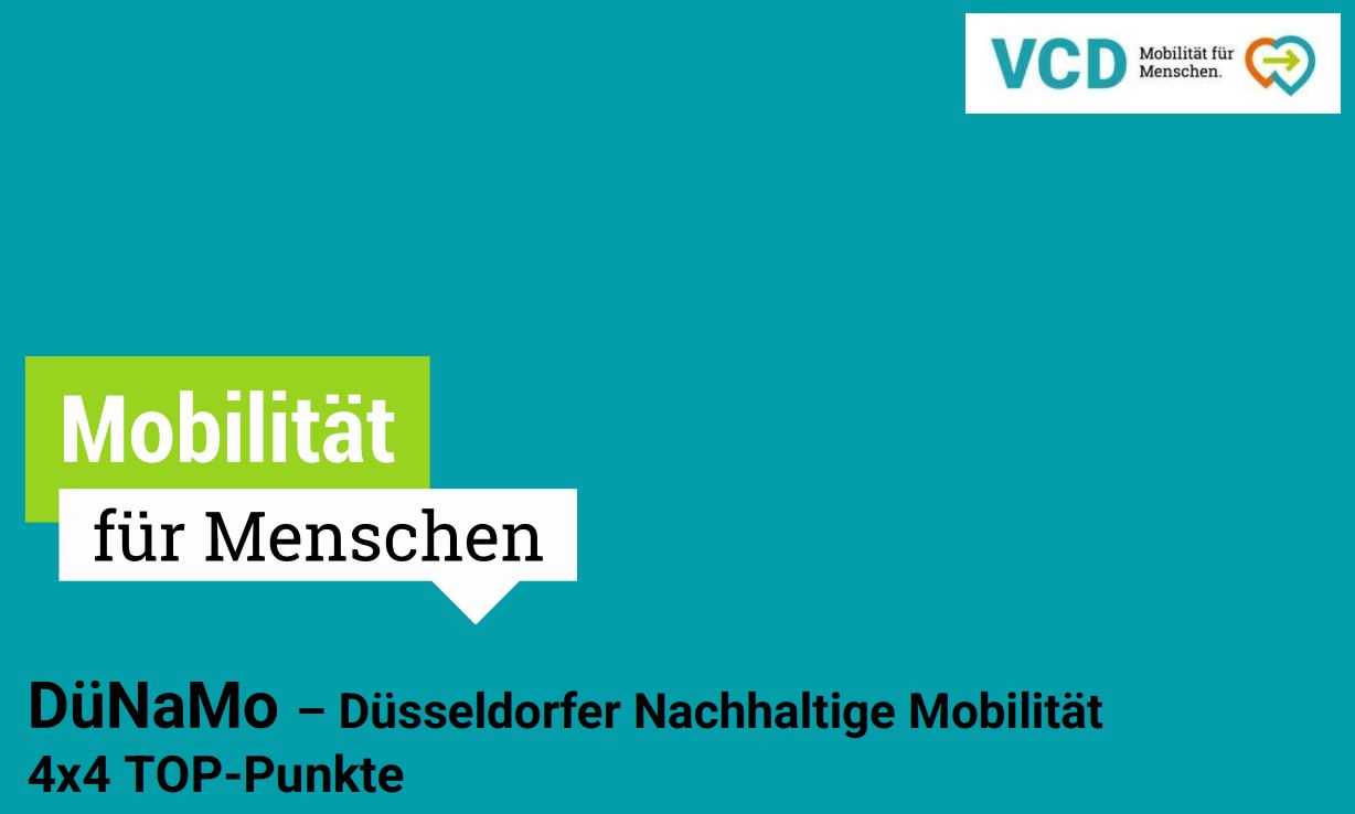 Der umweltorientierte Verkehrsclub Deutschland (VCD) hat unter dem Titel "DüNaMo 4x4" (= Düsseldorfer Nachhaltige Mobilität in 4 x 4 Punkten) Wünsche und Vorschläge zur Verkehrspolitik in Düsseldorf für die künftige Ratskoalition zusammengestellt und an die Fraktionen von CDU und Grünen übermittelt mehr