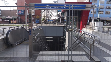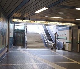 Auf den Fotos ist zu erkennen, dass da keine Baustelle mehr ist. Alles ist freigeräumt, alle Steine wurden verlegt und jede Wand ist verkleidet. Aus irgendeinem Grund steht aber oben vor der Treppe am Friedrich Wilhelm Platz ein Gitter. Warum? Warum dürfen hier keine Fahrgäste die fertige Treppe benutzen? Warum läuft die Rolltreppe nicht?