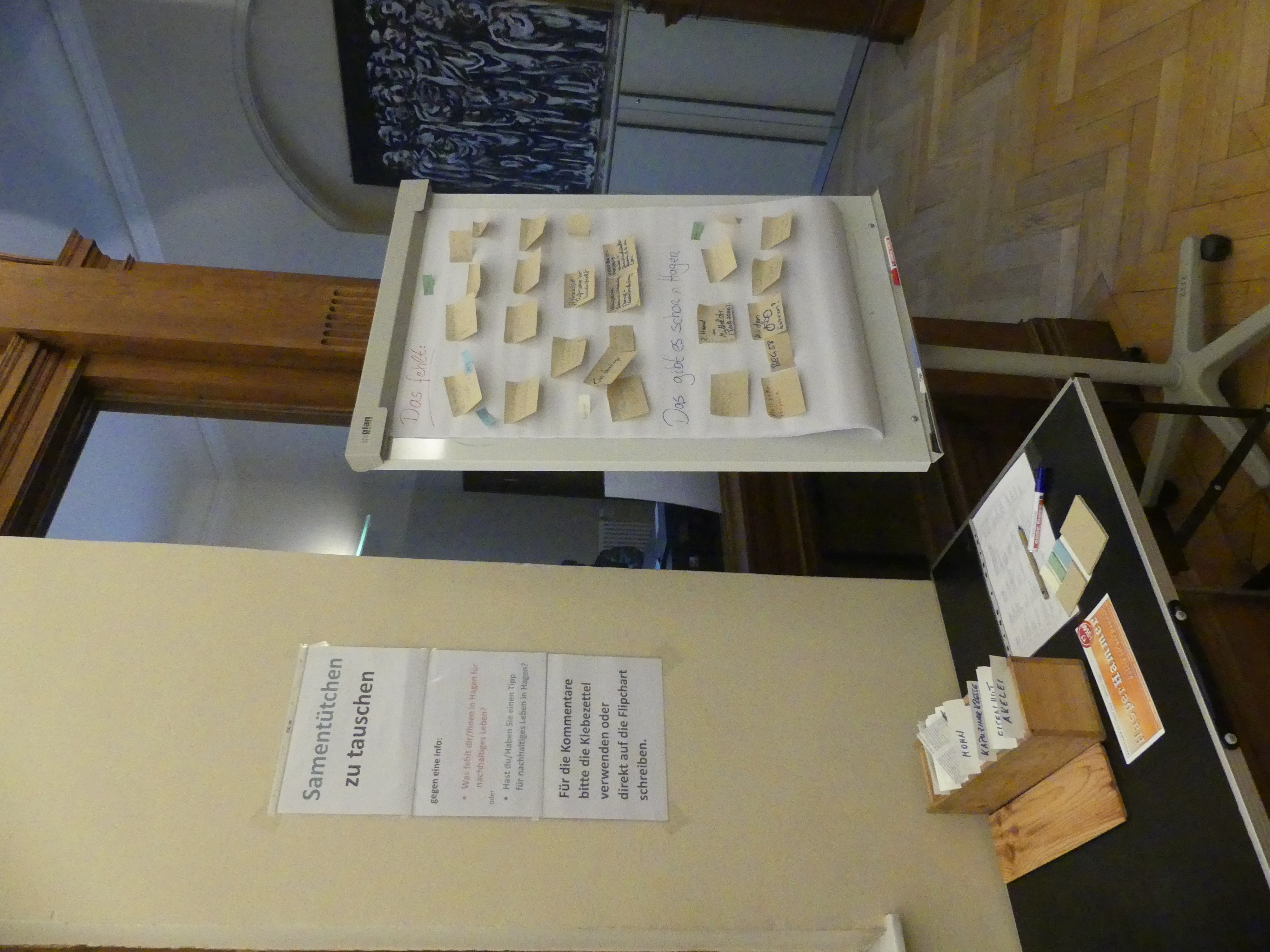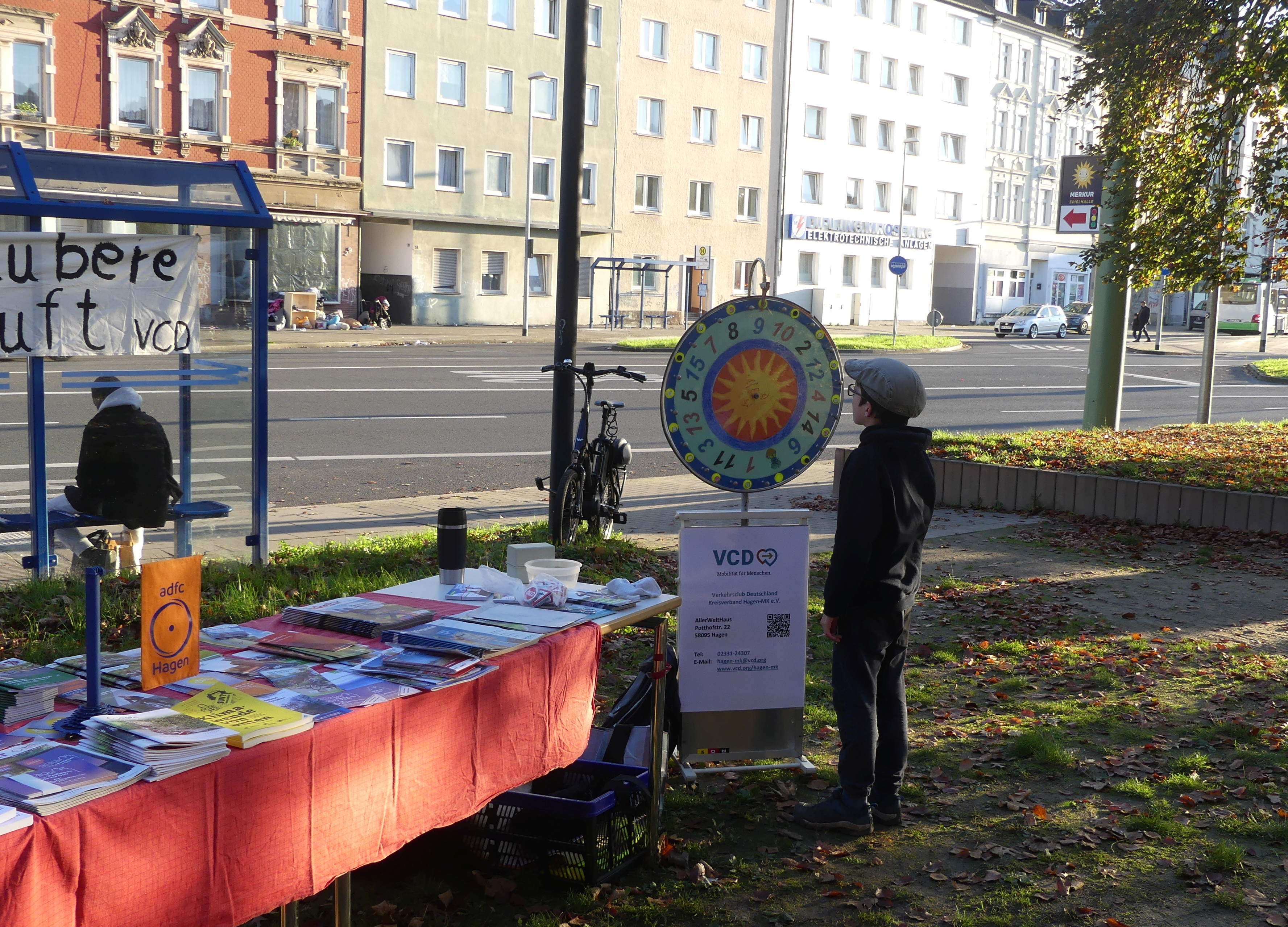 Auch wir waren zusammen mit dem ADFC dabei. Es gab einen Stand mit Material und das Glücksradquiz mit Fahrradfragen für Kinder. Auf dem Parkplatz hatte der ADFC einen Fahrradparcour für Kinder aufgebaut. Außerdem gab es im Flur der VHS eine Pinnwand, auf der die Besucher Tips für ein nachhaltiges Leben in Hagen anpinnen konnten. Zur Belohnung gab es ein Samentütchen.