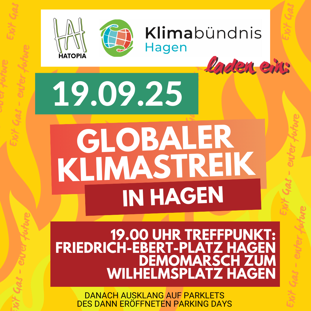 Am Freitag, den 19. September 2025, ruft Hatopia zusammen mit dem Klimabündnis Hagen zum Klimastreik in Hagen auf. Treffpunkt ist um 19Uhr am Friedrich-Ebert-Platz, von dort zieht die Demonstration zu Fuß oder mit dem Rad schiebend bis zum Wilhelmsplatz.