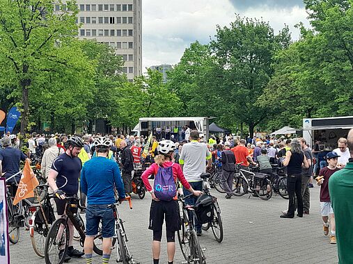 Mit kleinen Stopps in Haan, Erkrath und am Gertrudisplatz in Düsseldorf-Eller radelten einige hundert Menschen fröhlich zum Johannes-Rau-Platz unweit des Landtages in Düsseldorf.