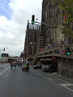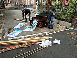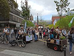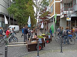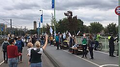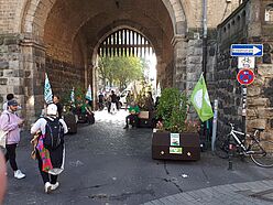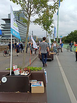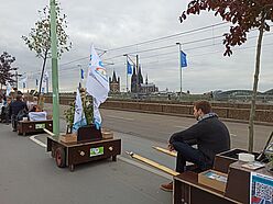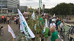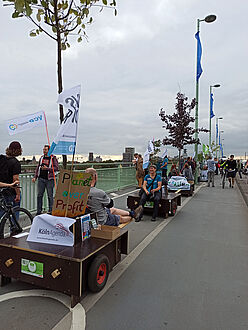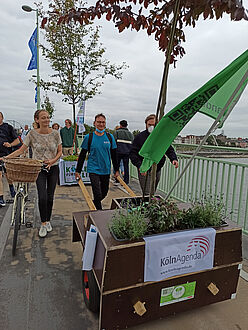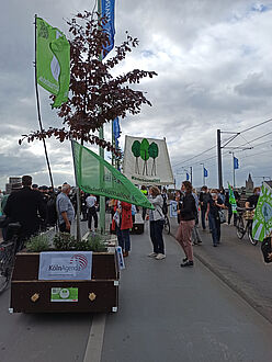 Wir sind von allen drei Startorten –Uniwiesen/Bachemer Str.; Chlodwigplatz; Theodor-Heuss-Ring gestartet und haben uns dann auf der Deutzer Brücke getroffen. In einer langen Reihe hatten wir die Module am Rand des Fahrradwegs abgestellt und ein Bild davon gegeben, wie die Brücke mit Bäumen aussehen würde, was den meisten Vorbeikommenden wirklich gut gefiel!