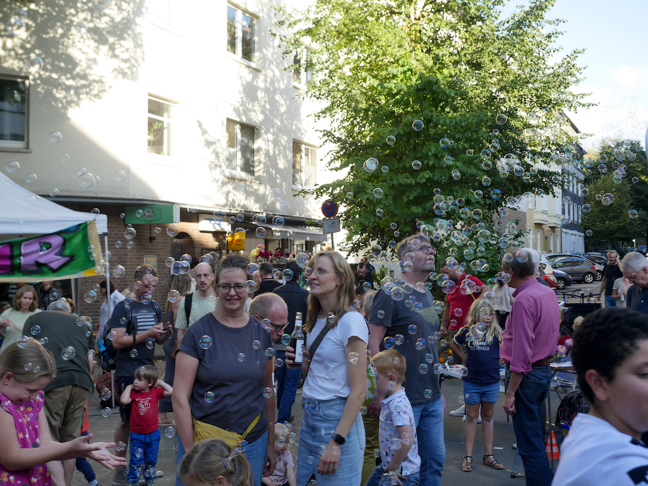 Platz und Straße wurden zur bunten Tanz- und Aktionsfläche. Am Nachmittag gab es Informationsstände unter anderem vom VCD, ADFC oder der Bürgerenergie-Genossenschaft; außerdem Spiele nicht zuletzt auch für Kinder, am Abend Silent Disco, den ganzen Tag über Essen, Trinken, Klönen.