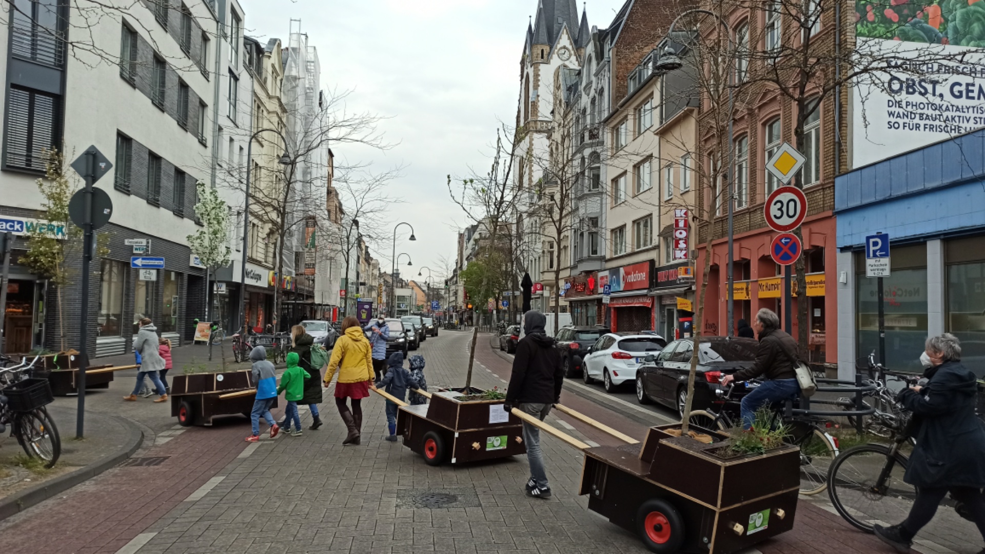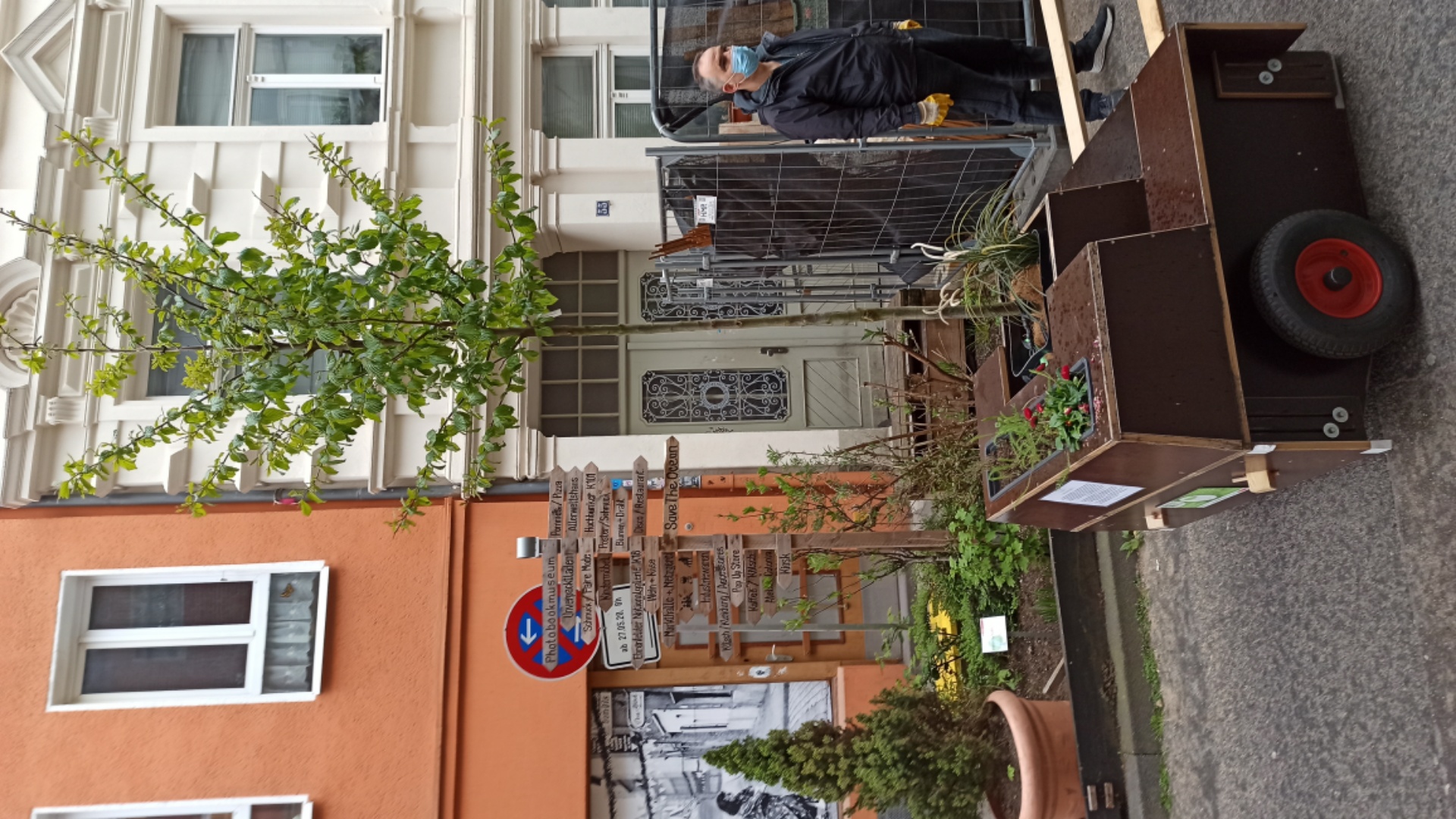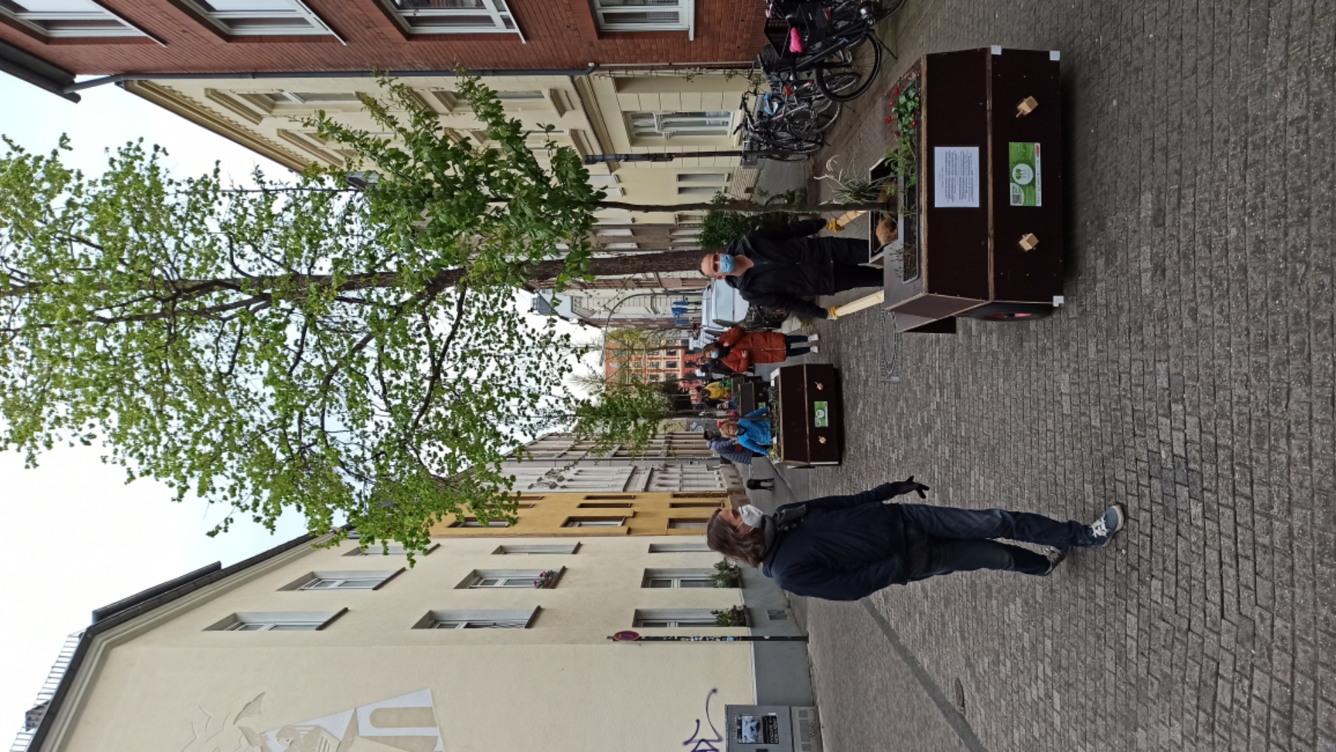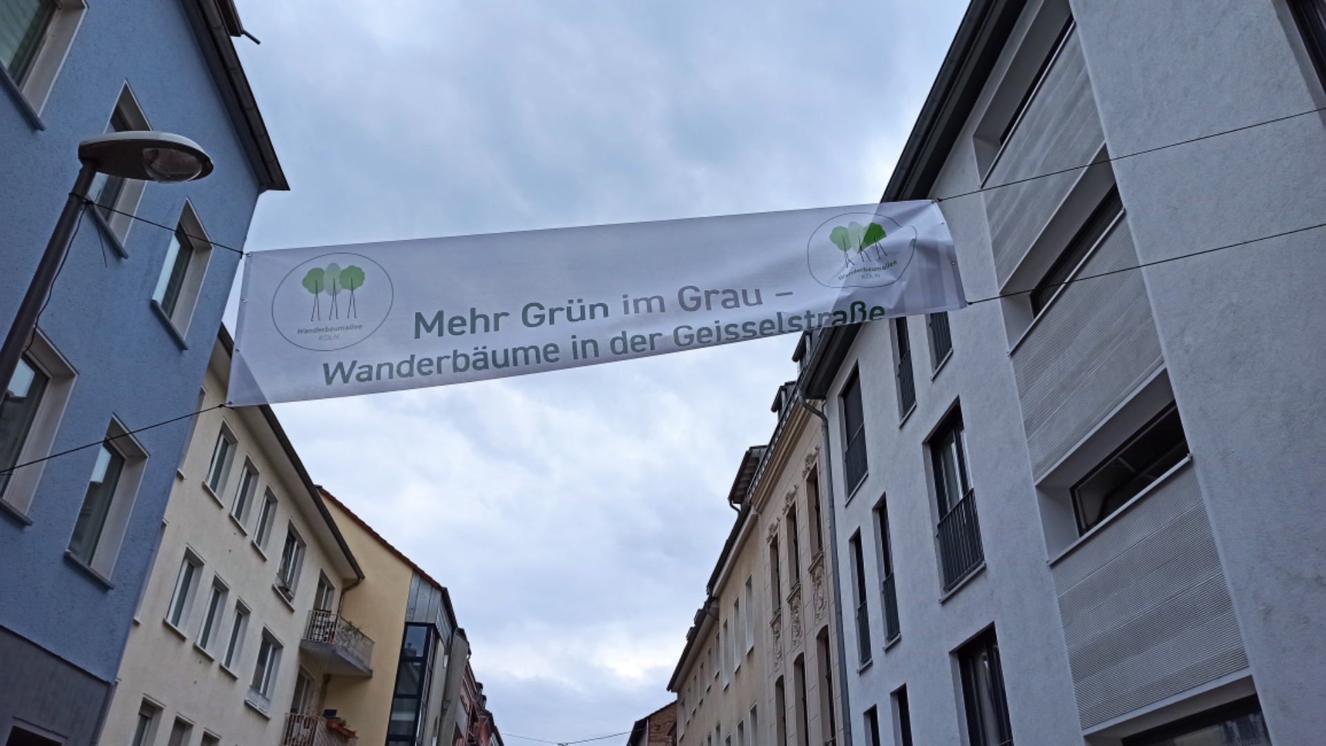 Auch wenn zurzeit leider keine großen Treffen oder Aktionen an der WBA stattfinden können, bleibt unsere Intention bestehen, wie auch auf dem tollen Banner, der quer über der Straßen hängt, zu lesen ist: „Mehr Grün im Grau – Wanderbäume in der Geisselstraße.“ Hier bieten sie nun in den nächsten sechs bis acht Wochen all denjenigen einen schöne Aufenthaltsort und einen Platz in der Sonne, die keinen Balkon haben, sich draußen mit Abstand an der frischen Luft auf einen kurzen Plausch treffen wollen oder auch einfach die blühende frühlingshafte Natur aus ihrem Fenster heraus genießen wollen.