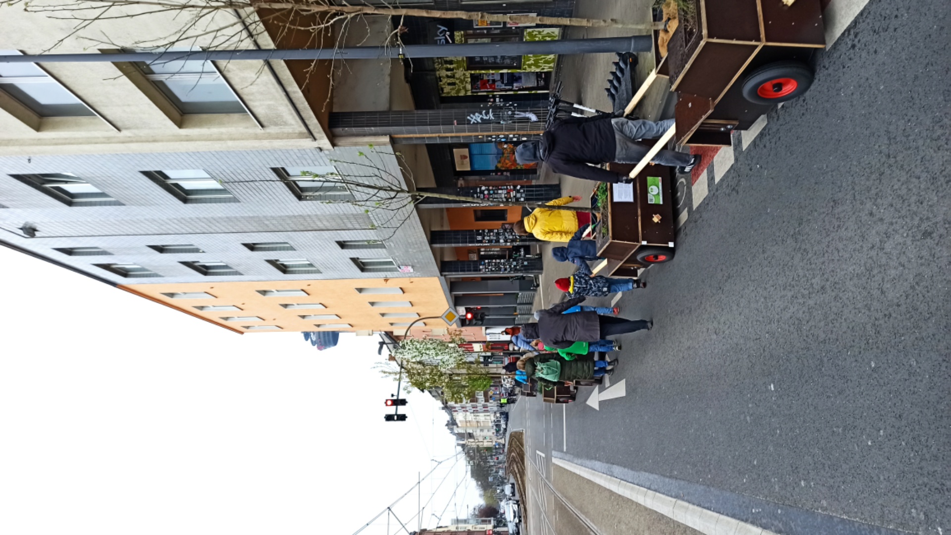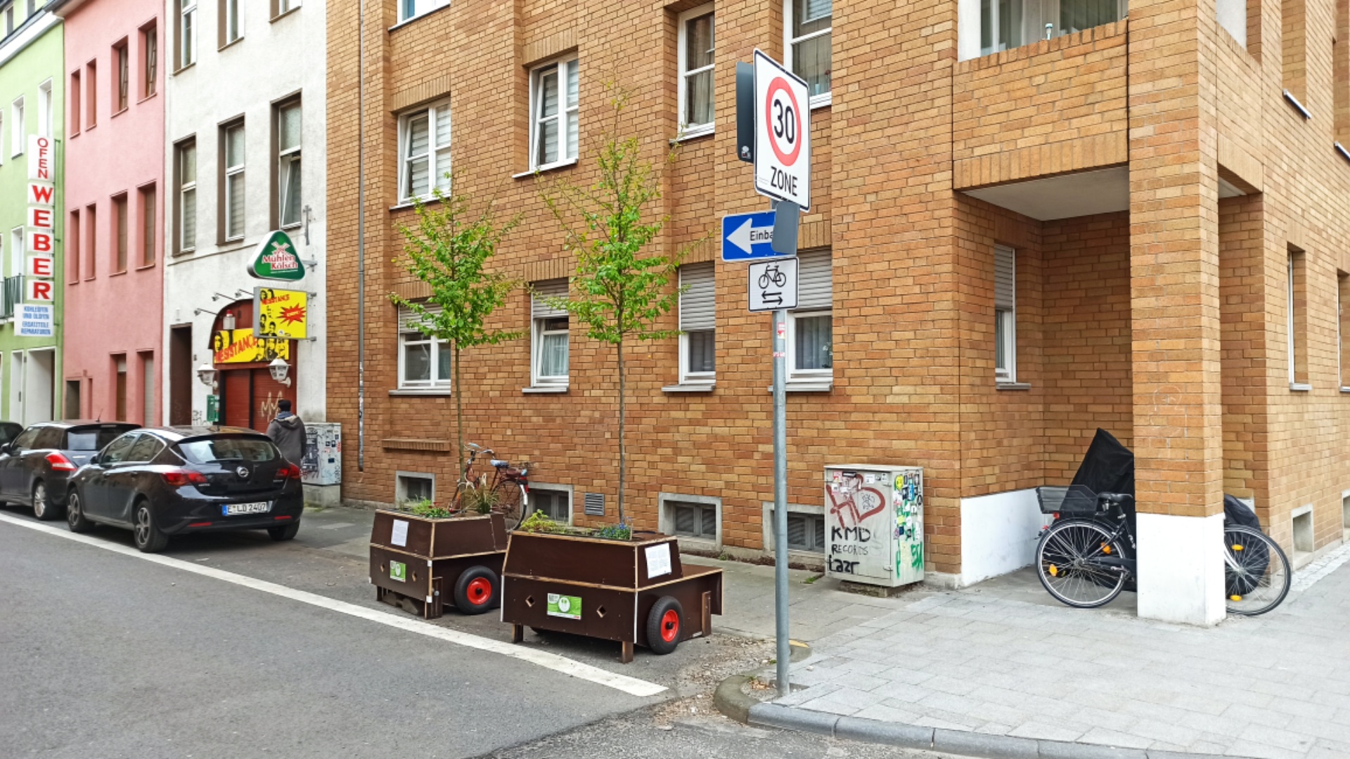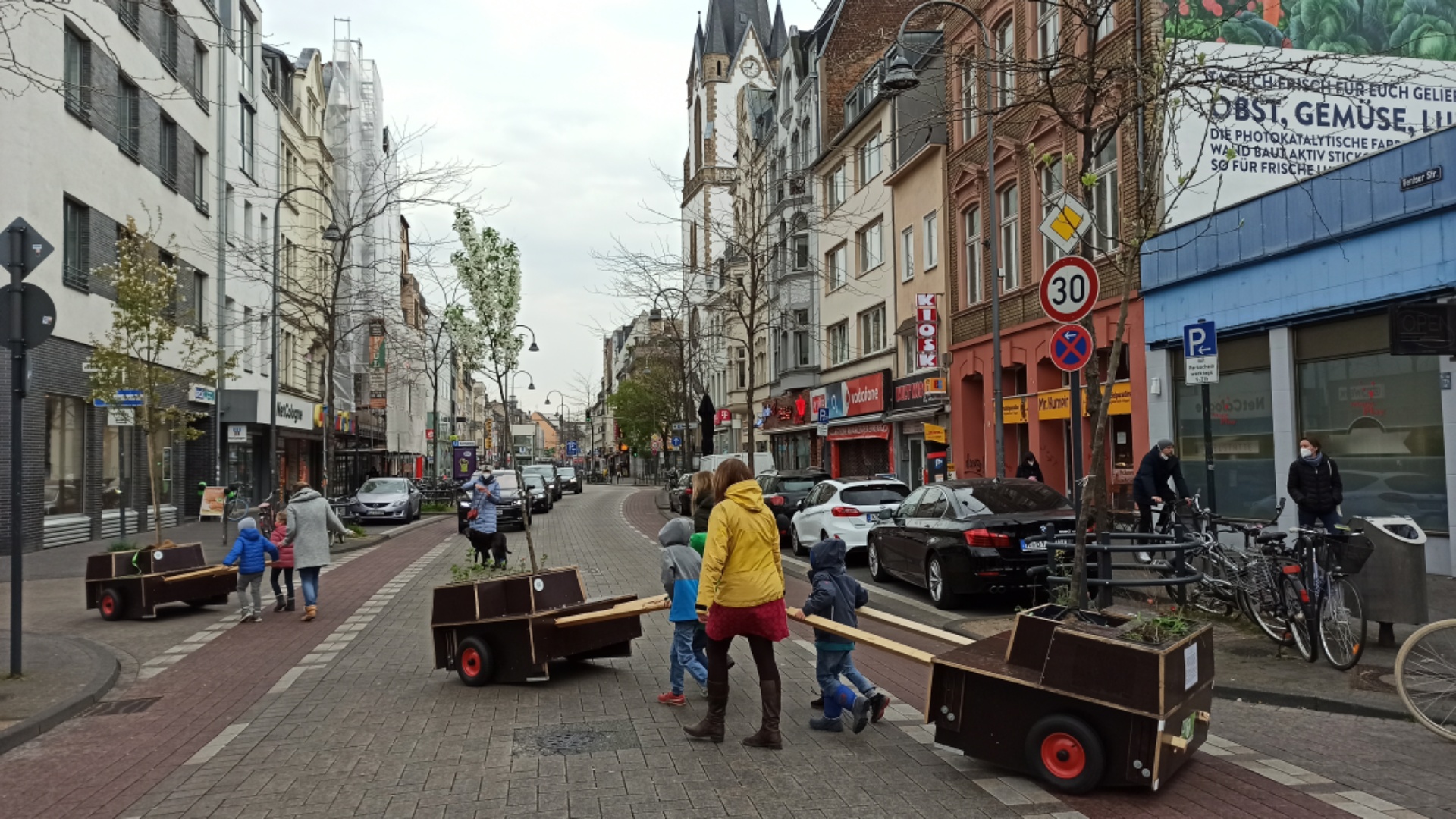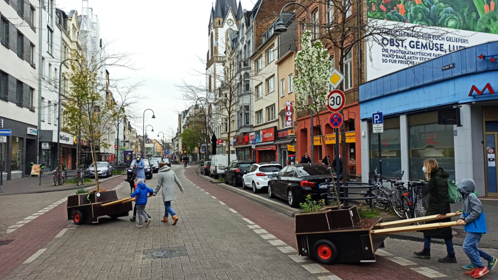 Auch wenn zurzeit leider keine großen Treffen oder Aktionen an der WBA stattfinden können, bleibt unsere Intention bestehen, wie auch auf dem tollen Banner, der quer über der Straßen hängt, zu lesen ist: „Mehr Grün im Grau – Wanderbäume in der Geisselstraße.“ Hier bieten sie nun in den nächsten sechs bis acht Wochen all denjenigen einen schöne Aufenthaltsort und einen Platz in der Sonne, die keinen Balkon haben, sich draußen mit Abstand an der frischen Luft auf einen kurzen Plausch treffen wollen oder auch einfach die blühende frühlingshafte Natur aus ihrem Fenster heraus genießen wollen.